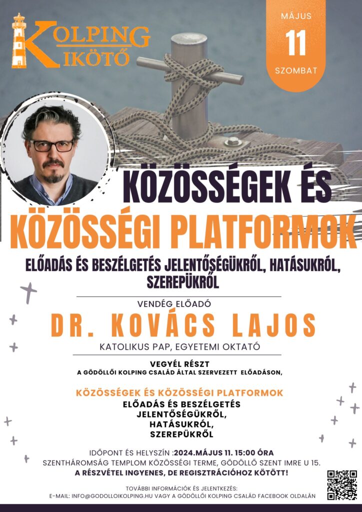 A Kolping Kikötő következő előadására május 11-én, délután 3 órakor kerül sor a közösségi házban. A téma a család minden tagjának szól: Közösségek és közösségi platformok, előadó Dr. Kovács Lajos atya. Szeretettel várnak mindenkit a szervezők.
