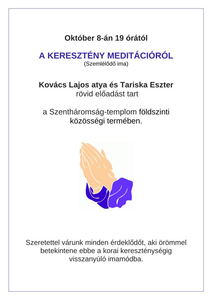 Október 8-án, szombaton, az esti szentmise után 19 órától Kovács Lajos atya és Tariska Eszter rövid előadást tart a szemlélődő imáról. Szeretettel várunk minden érdeklődőt, aki örömmel betekintene a keresztény meditációnak ebbe a korai kereszténységig visszanyúló imamódjába.