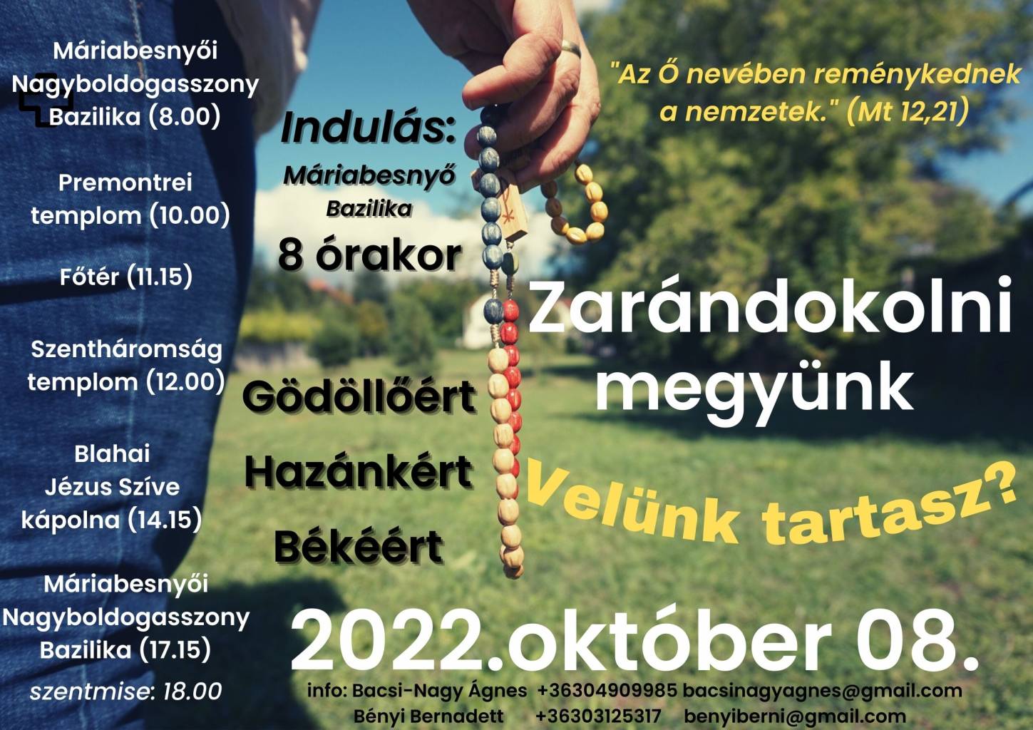 Október 9-ére zarándoklatot hirdetünk az egyházközség számára Mátraverebély- Szentkútra a Magyarok Nagyasszonya-Rózsafüzér Királynője búcsúba. Indulás reggel 8 órakor, a Szentháromság Templom parkolójából. [distance1] Jelentkezni lehet Morzsányiné Ibolyánál és Kötélné Marikánál. [distance1] A zarándoklat költsége 2.000 forint!