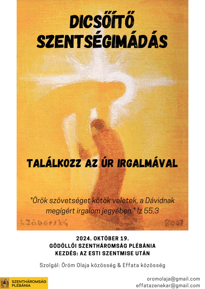 Október 19-én, szombaton, az esti szentmise után dicsőítő szentségimádást tartunk templomunkban. Mindenkit szeretettel várunk, aki vágyik Isten irgalmas jelenlétében időzni. Szolgál az Öröm Olaja Közösség és az Effata Dicsőítő Zenekar. Az alkalom után agapéra várunk minden kedves érdeklődőt.