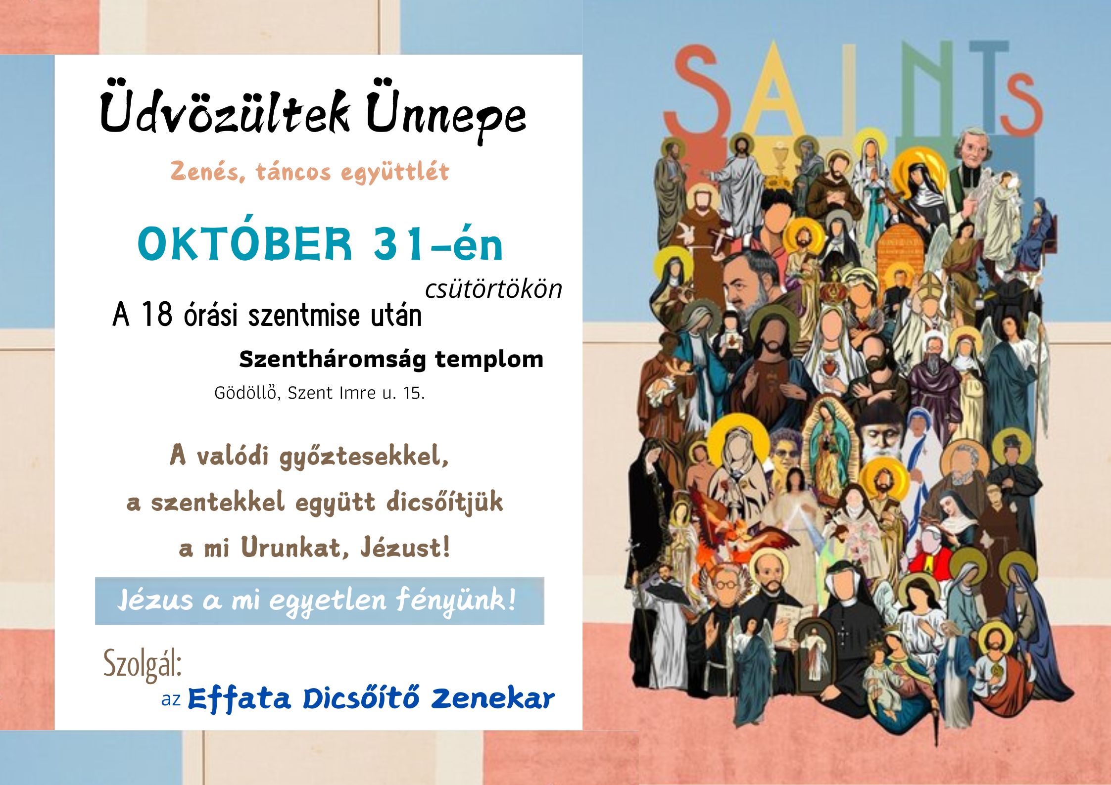 Október 31-én, az esti szentmise után zenés, táncos dicsőítés lesz a közösségi ház alagsorában. Ez az alaklom lehetőséget ad arra, hogy Istent dícsérjük mindenféle kötöttség nélkül. Az egy órásra tervezett alkalmon az Effata zenekar szolgál! Szeretettel várunk mindenkit!