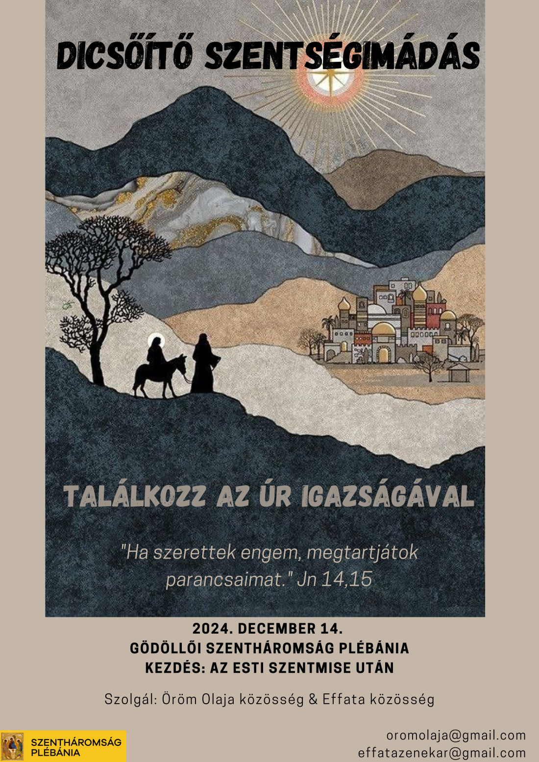 Szeretettel várunk benneteket decemberi dicsőítő szentségimádásunkra. Adventi készületünk derekán ne felejtkezzünk el a legfontosabbról; találkozzunk együtt az Úr Jézus igazságával, Szentlelkének erejével. [distance1] Időpont: december 14. szombat Az alkalom az esti szentmise után kezdődik és kb 20.45-kor ér véget. (előtte a 18 órai szentmise gitáros lesz) Gödöllő, Szentháromság templom (Szent Imre u. 15) [distance1] Szolgál az Öröm […]