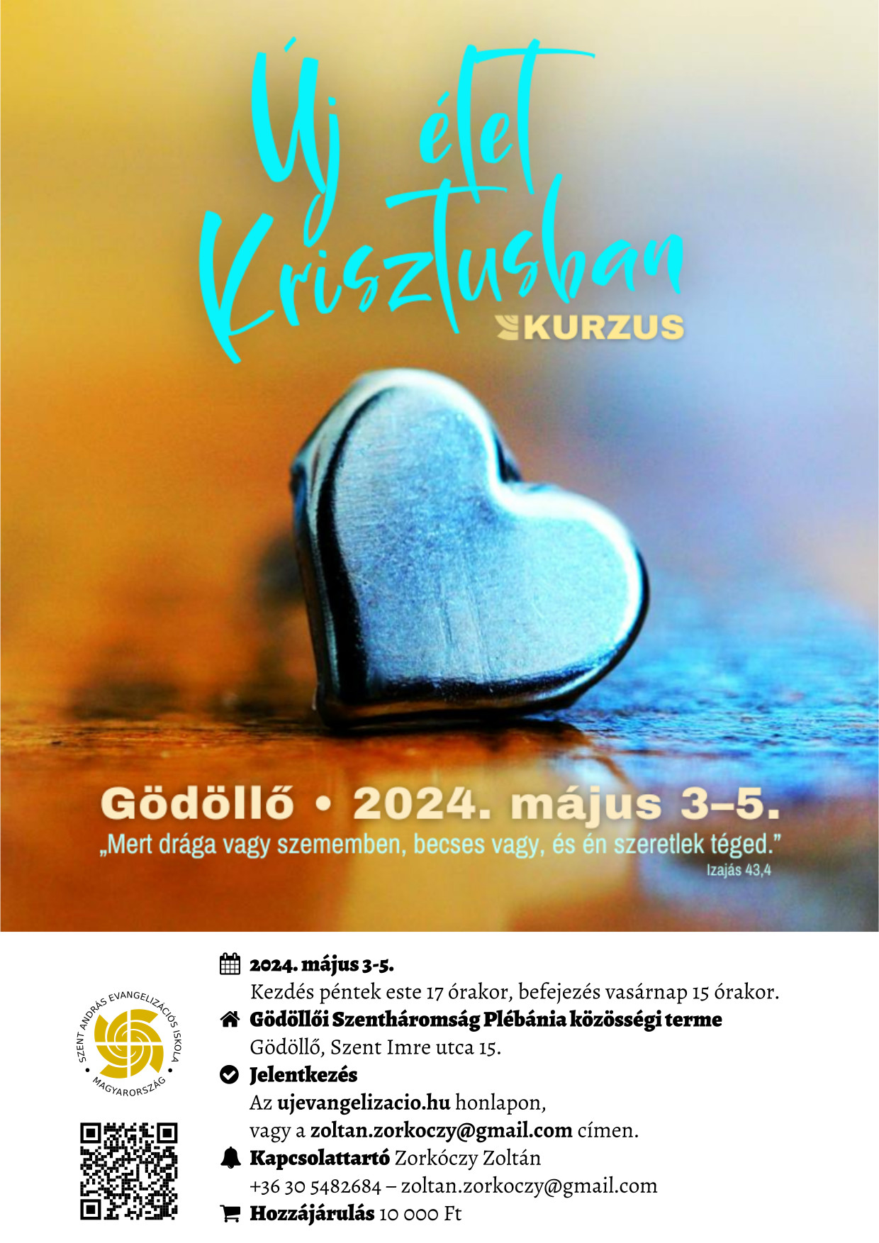 Új Élet Krisztusban kurzus lesz a Szentháromság Plébánia közösségi termében, amire a szervezők nagy szeretettel várják a Krisztusban megújulni vágyó testvéreket. Részletek: https://szentandras.ujevangelizacio.hu/meghivo/uj-elet-krisztusban-kurzus-godollon