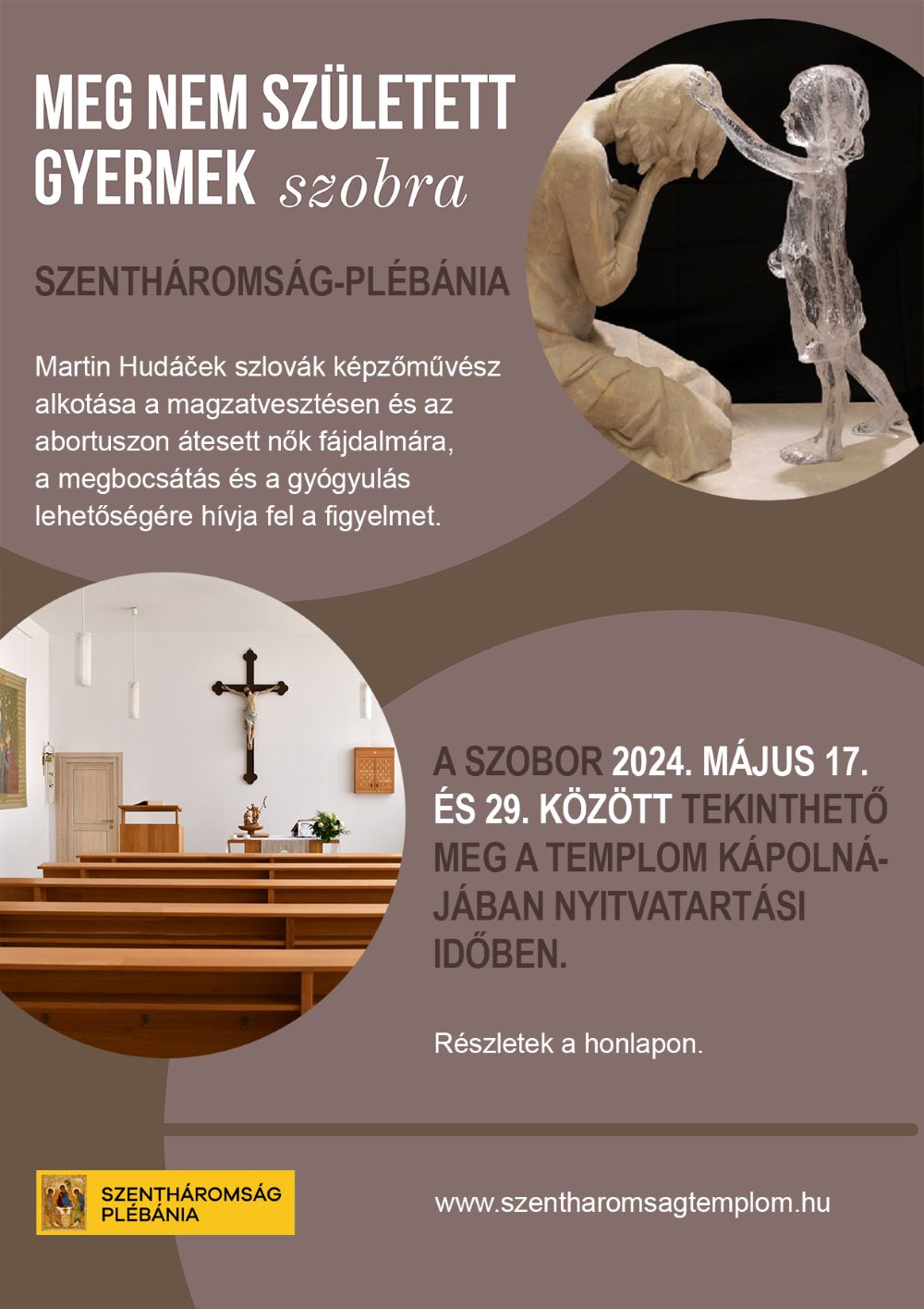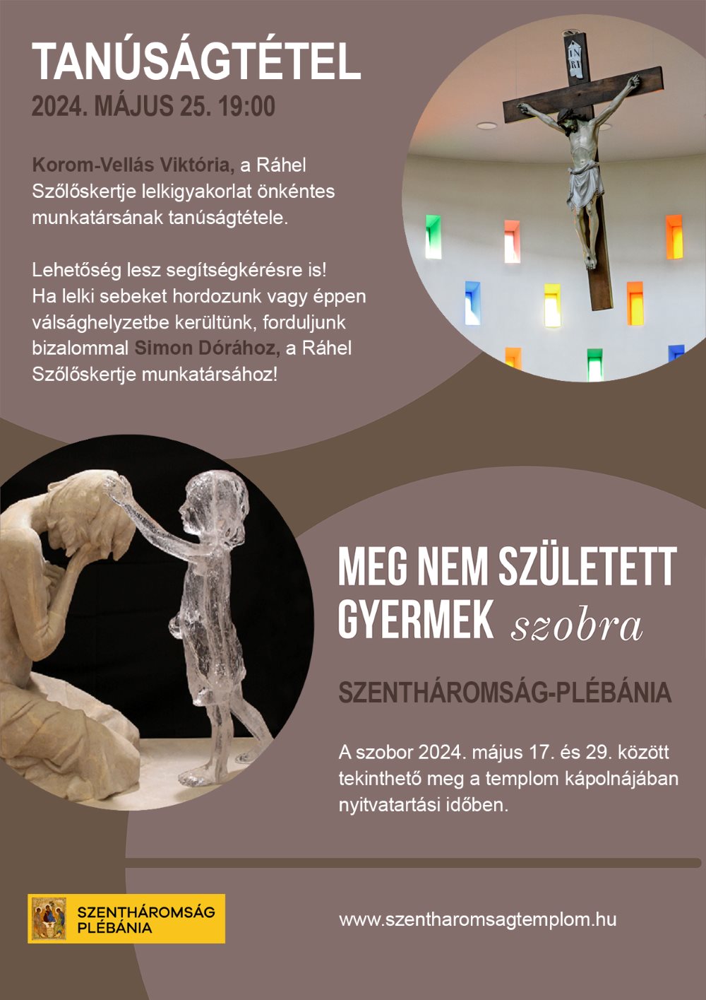 Szeretettel hívunk és várunk május 25-én 19 órára Korom-Vellás Viktória, a Ráhel szőlőskertje lelkigyakorlat önkéntes munkatársának tanúságtételére! Május 29-ig a kápolnában még látogatható a Meg nem született gyermek szobra. Részletek a plakáton.