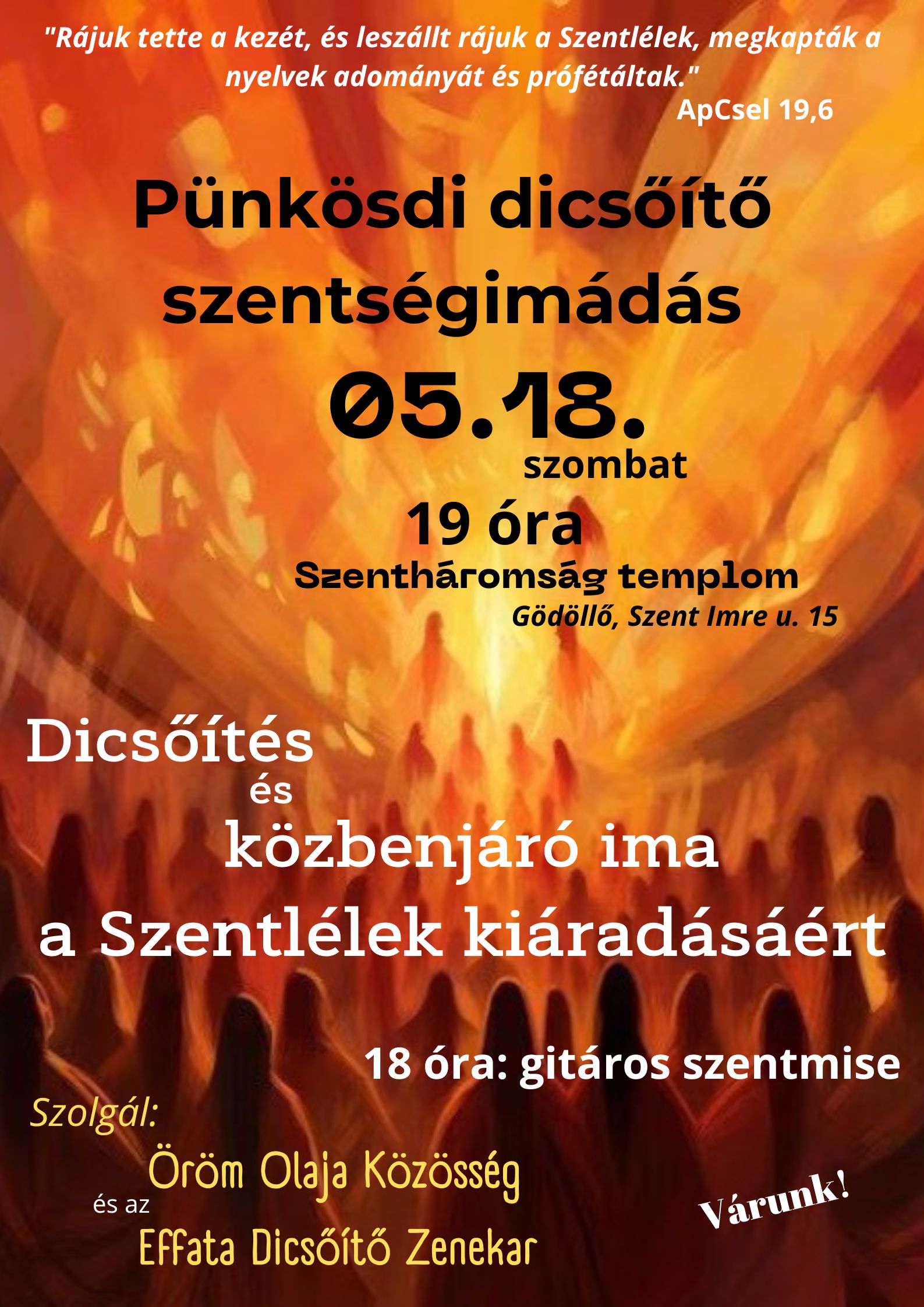 Szombaton (05.18.) este 7 órakor dicsőítő szentségimádást tartunk, melynek keretében közbenjáró ima lesz a jelenlévőkért. A Szentlélek megújító erejét kérjük mindennapjainkhoz. A 6 órakor kezdődő szentmise gitáros lesz. Mindenkit nagy szeretettel vár az Öröm Olaja Közösség és az Effata Dicsőítő Zenekar!